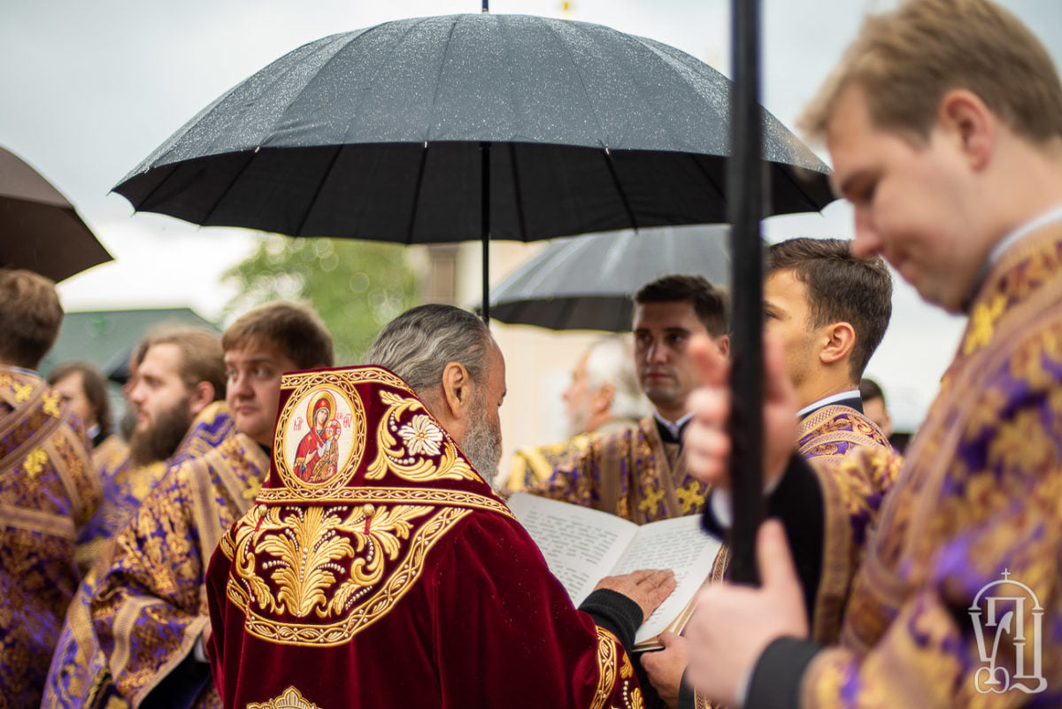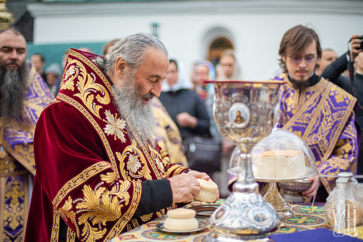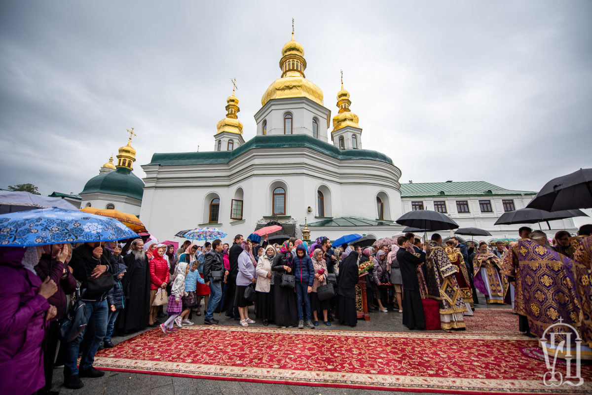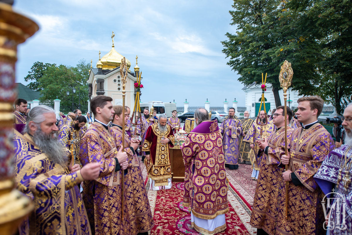 За Божественною літургією на площі біля Ближніх печер обителі Предстоятелю співслужили намісник Києво-Печерської обителі митрополит Вишгородський і Чорнобильський Павел, керуючий справами УПЦ митрополит Бориспільський і Броварський Антоній, єпископ Білогородський Сильвестр, єпископ Бородянський Марк та духовенство монастиря.