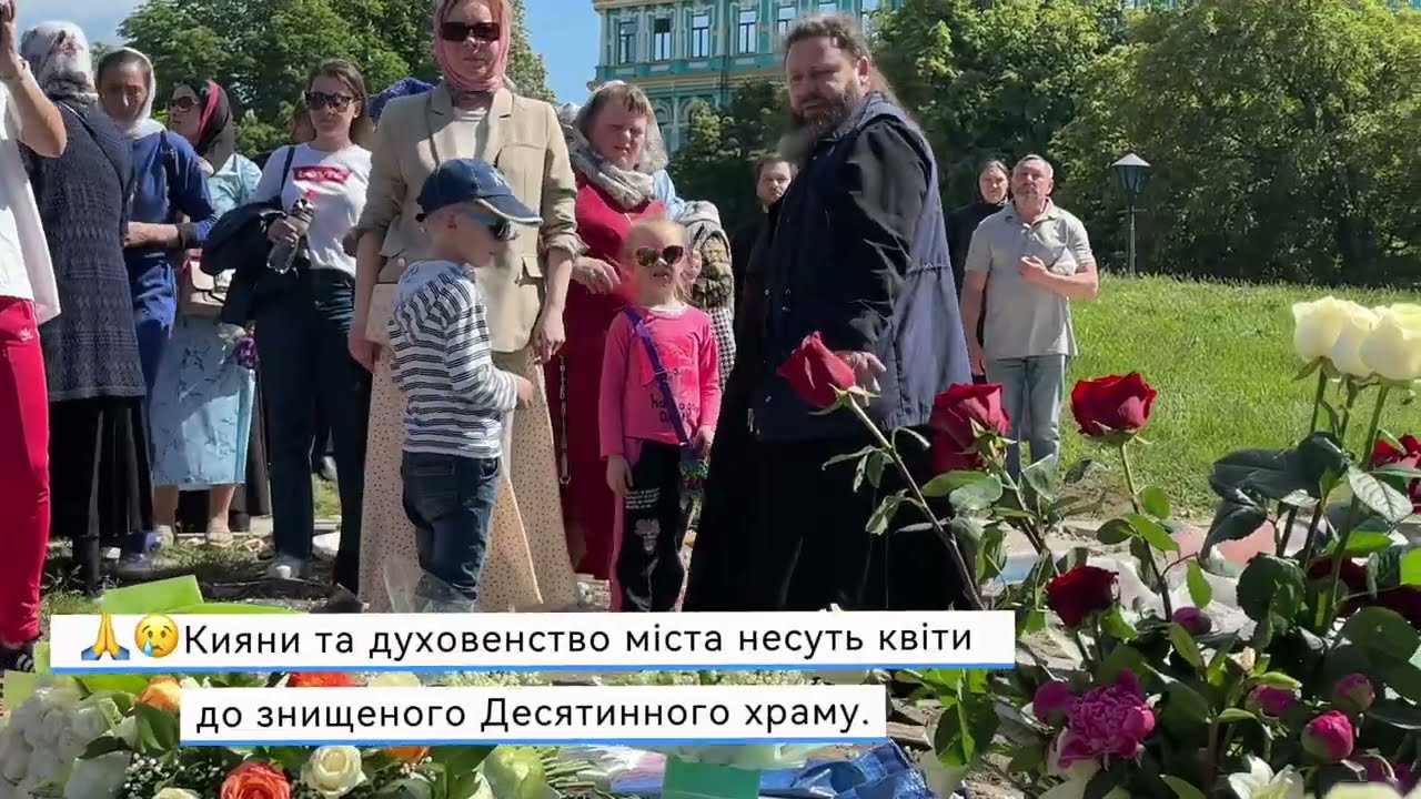Кияни, священнослужителі Києва та віруючі з різних єпархій несуть квіти на місце руйнування на честь рівноапостольних князів Володимира та Ольги Десятинного монастиря у м. Києві.