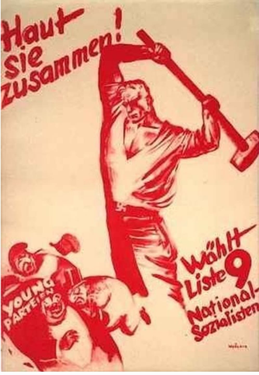 Да, этот мускулистый арийский пролетарий с кувалдой он прям ушлый малый — везде трудоустроился