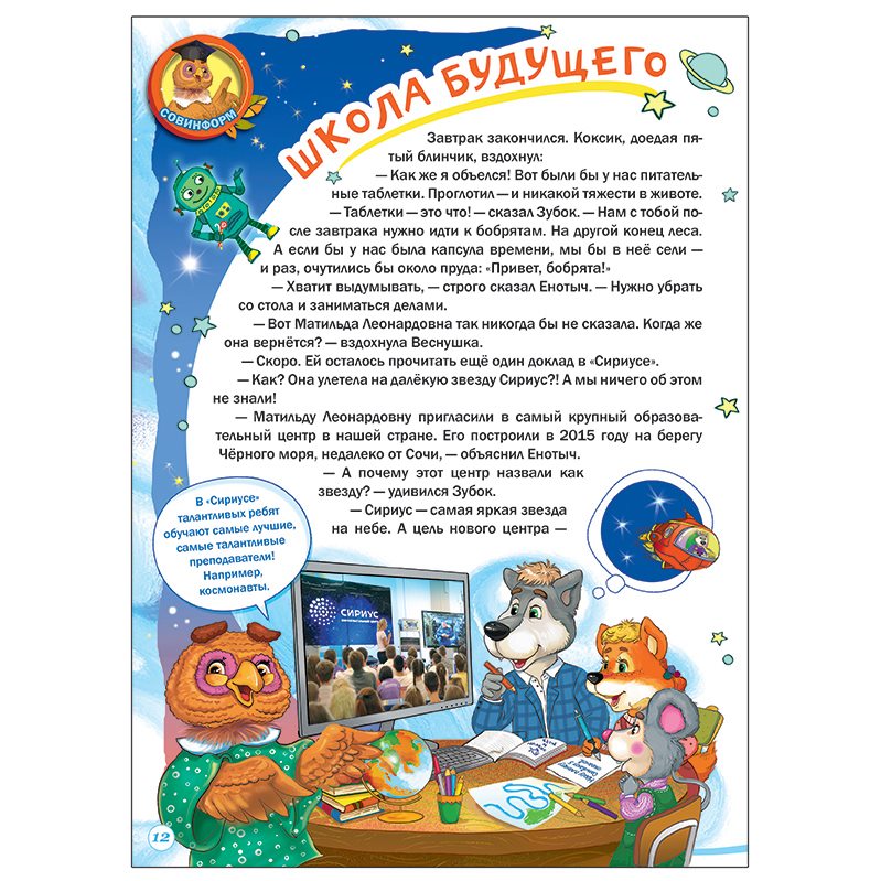 «Совинформ» – Енот Енотыч рассказал Шуне, Веснушке, Зубку и Коксику о «Сириусе», самом большом образовательном центре в нашей стране. А сова Матильда Леонардовна предложила шишкинлесовцам туда съездить. Чтобы познакомиться с талантливыми учениками «Сириуса».