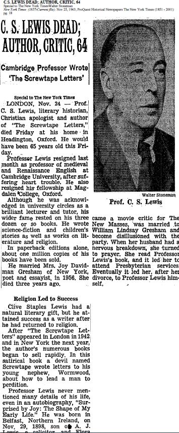 «Пик утрат пришёлся для меня на 22 нояб., для меня это был не день, когда убили Кеннеди, но день, когда умер К.С. Льюис», – писал Толкин. Его друг умер, не дожив нескольких дней до 65 лет, менее чем за час до того как застрелили американского президента, через двенадцать минут после того как скончался от рака Олдос Хаксли, автор антиутопии «О дивный новый мир».