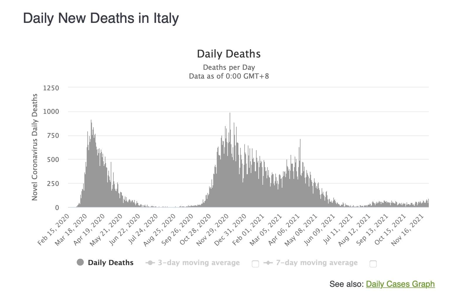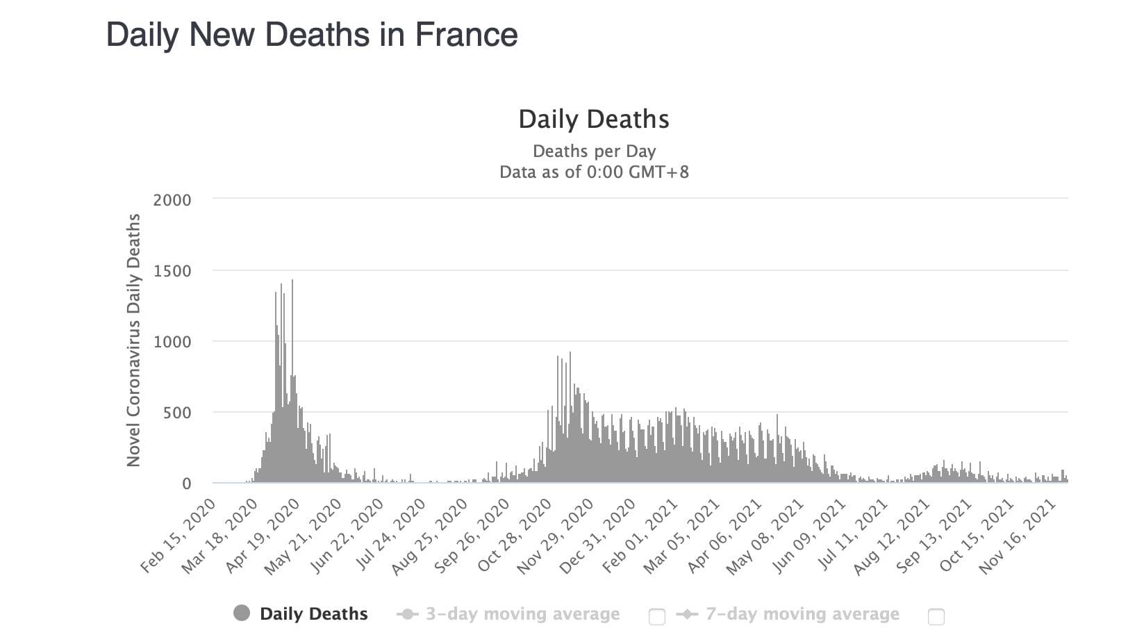 Не знаю. Вот вам наглядные графики. Ежедневная смертность. Италия, с которой все началось в Европе, Франция и Россия. При этом ни Италия, ни Франция не являются лидерами по вакцинации населения. В обеих этих странах вакцинировано чуть больше 70% населения. В Израиле, о котором тоже любят часто говорить, ещё меньше. А необходимо 80% — и выше.