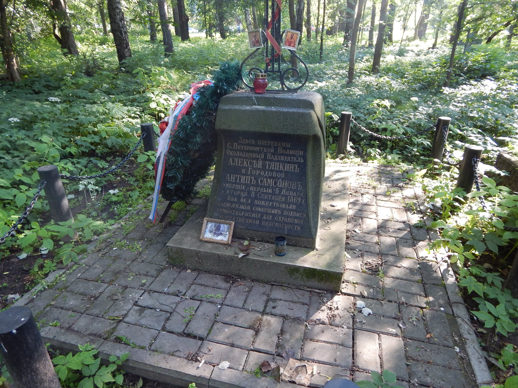Утром 8 ноября 1868 года городовой 1-го участка Адмиралтейской части Алексей Тяпкин, дежуривший на Невском проспекте, пренебрегая опасностью для собственной жизни, остановил несущуюся, никем не управляемую тройку коней, получив тяжелейшие травмы, от которых позже скончался. 8 сентября 1869 года при схожих обстоятельствах погиб городовой 2-го участка Спасской части Антип Самсонов. При проезде по Большой Садовой улице курьера МВД, его лошадь понесла, и снеся по дороге несколько лотков, врезалась в легковые дрожки. Напуганная столкновением, лошадь понесла по многолюдному Чернышову переулку. Дежуривший на углу переулка полицейский бросился останавливать несущиеся дрожки, но сбитый и смятый лошадью скончался на месте… Оба героя покоятся рядом, в западной части Смоленского Православного кладбища. Памятник был установлен в 1869 году, автор неизвестен. Могилу полицейских в конце 1980-х годов обнаружили участники межвузовской студенческой группы «Русское знамя». В 2007 году был открыт восстановленный надгробный камень. На сегодня это единственный сохранившийся с дореволюционных времён памятник чинам русской полиции в регионе.