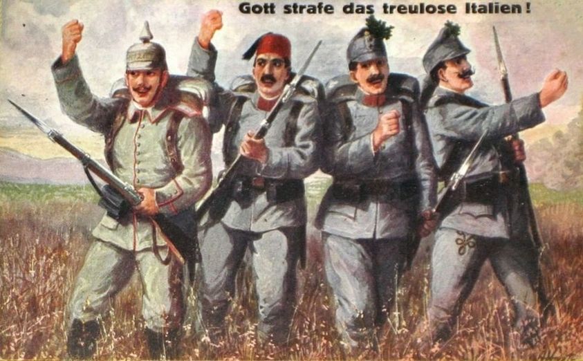 На картинке: благочестивые воины центральных держав выражают уверенность, что Бог покарает предательских итальянцев. Но что-то пошло не так.