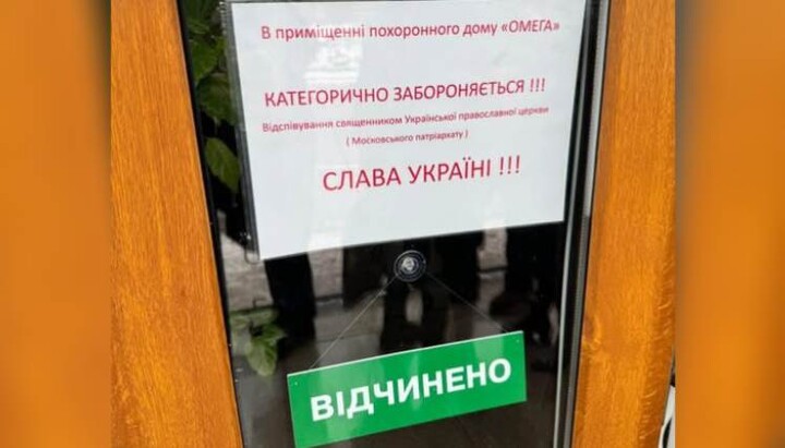 На фотографии, сделанной у входа в агентство, расположенное в Киеве, четко виден текст, набранный заглавными буквами: «В помещении похоронного дома «Омега» КАТЕГОРИЧЕСКИ ЗАПРЕЩАЕТСЯ!!! отпевание священником Украинской Православной Церкви (Московского патриархата). Слава Украине!!!».